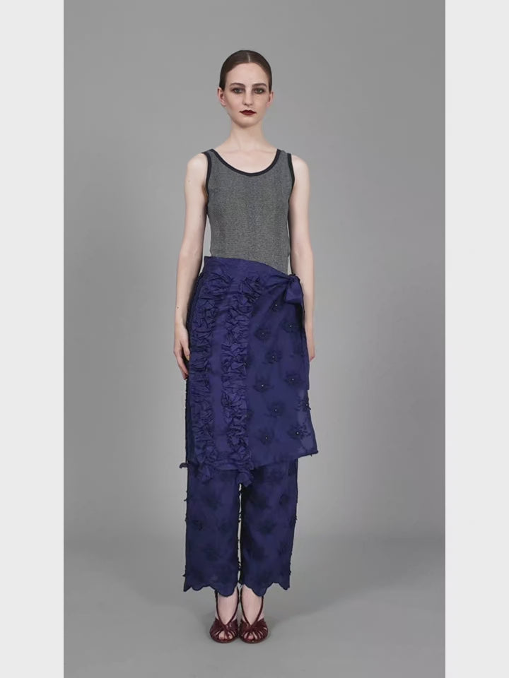 crinkleのシグニチャーである3Dフラワーの刺繍をインドのレーヨンシャンタンに施したエプロンスカートです。