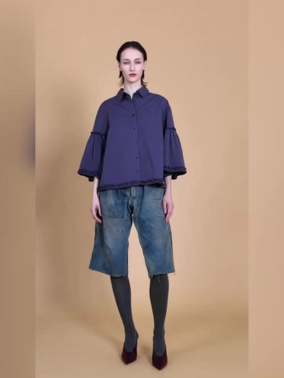 全体的に広がるフレアシルエットと、スリーブに施されたギャザーが華やかなベルスリーブを生み出したシャツ。