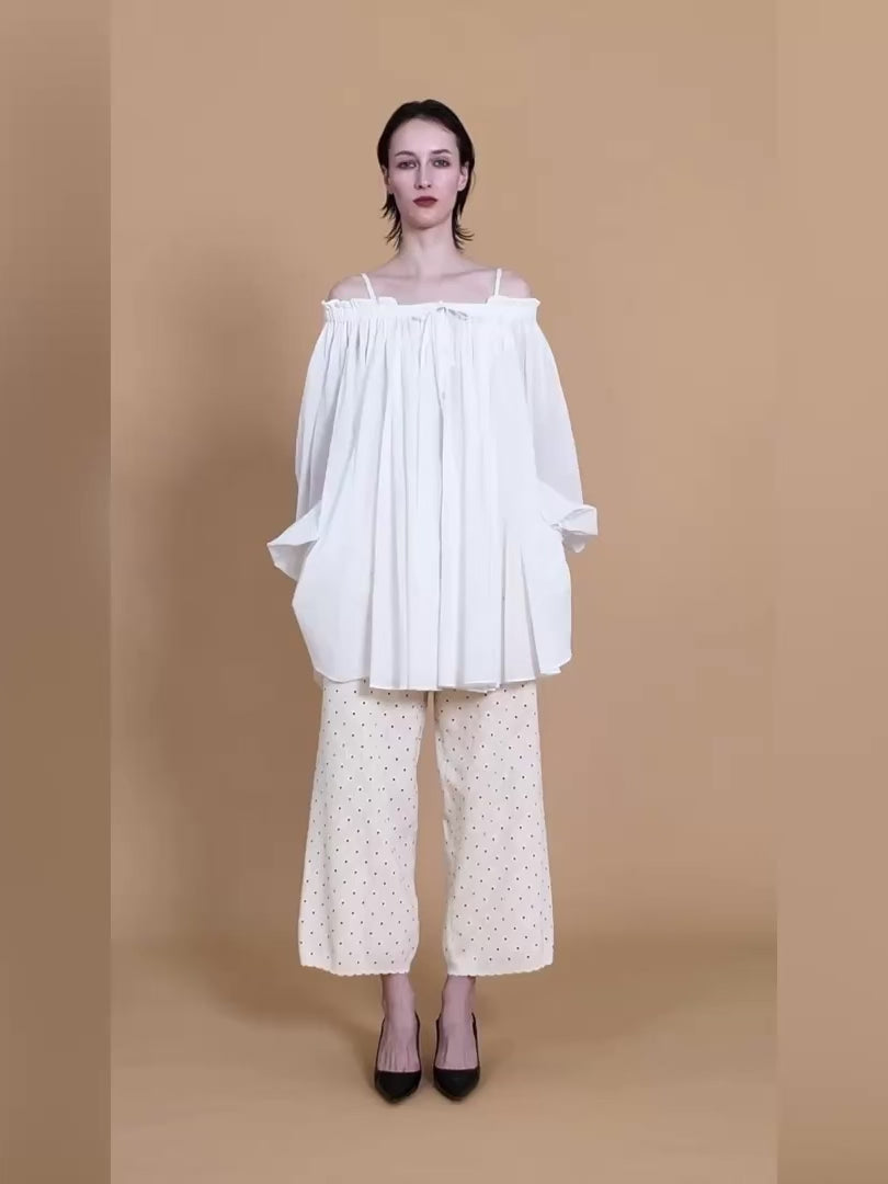 首元を紐で調整しながらオフショルダーやワンショルダーなど着方を変化させ