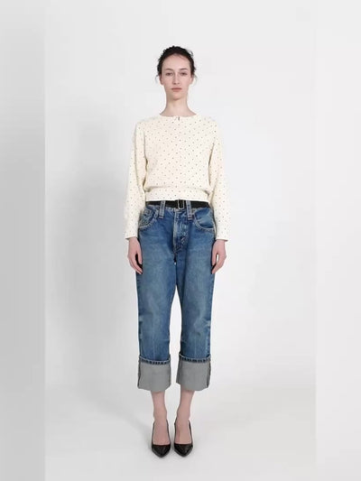 首元のさりげないフリルや、ツヤのあるボタンもポイント。